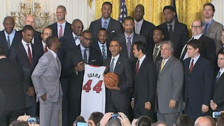 President Barack Obama honored the NBA champion Miami Heat at the White House today. After some good will jabs from the President toward James, Wade and others - the team stood tall to take a group picture with the President.